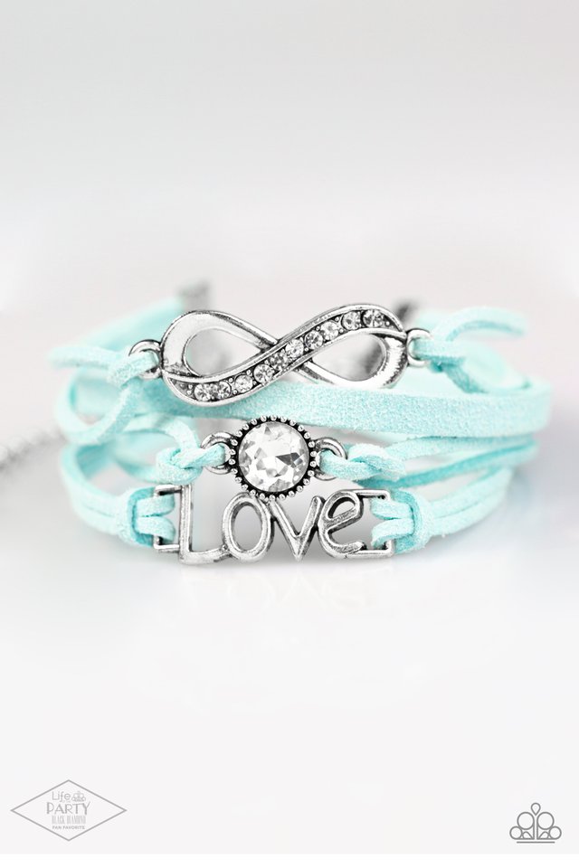 Strands of blue suede knots around silver charms, including a glittery infinity charm, a solitaire rhinestone, and a charm whimsically spelling out LOVE across the wrist. Features an adjustable clasp closure.