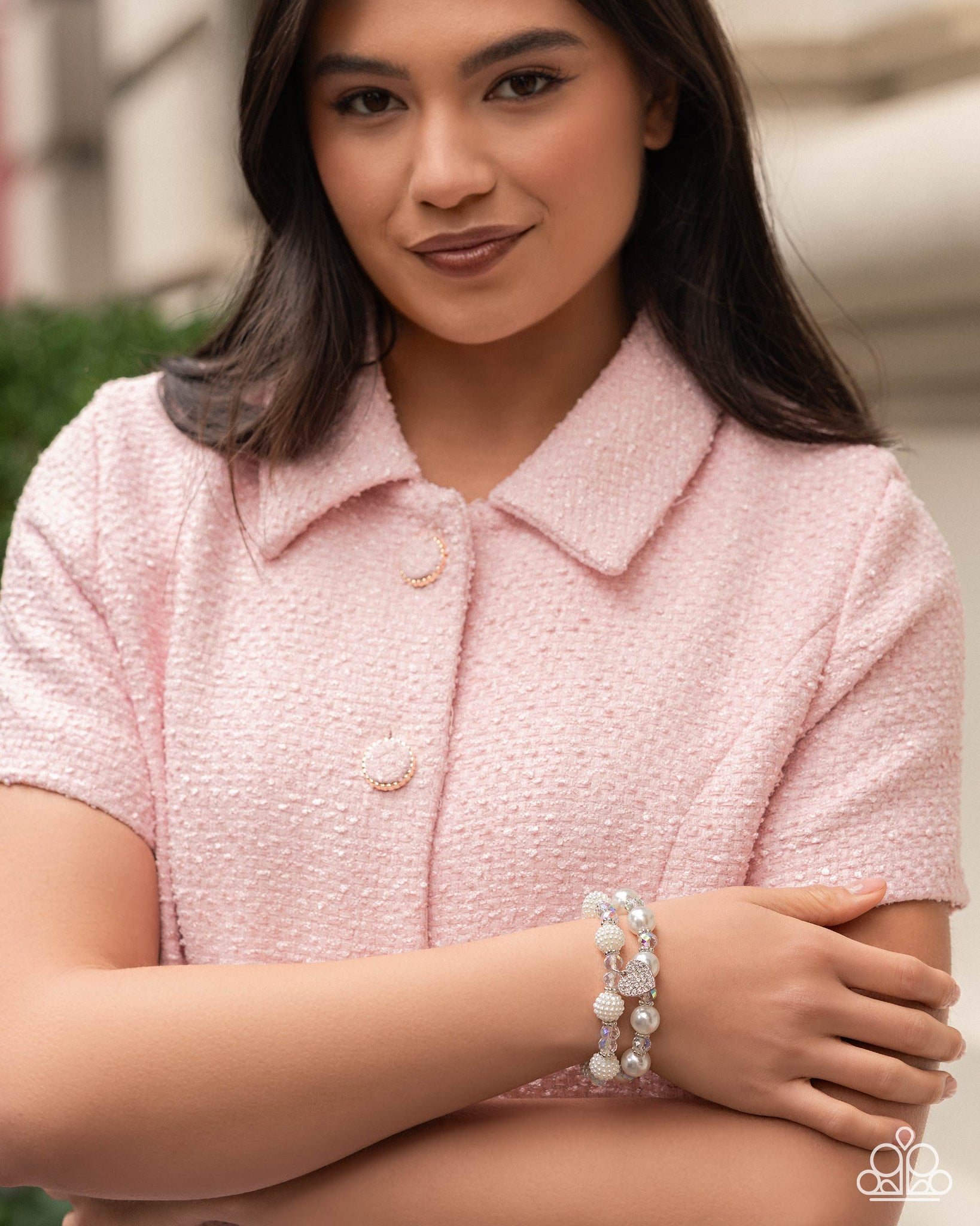 Infused along elastic stretchy bands, a collection of silver floral beads, faceted crystal-like beads, UV-shimmery white beads, dainty white pearl-dotted ornaments, and oversized white pearls patterns along the wrist, held together by a white rhinestone-dusted silver heart padlock charm for a romantically radiant display.