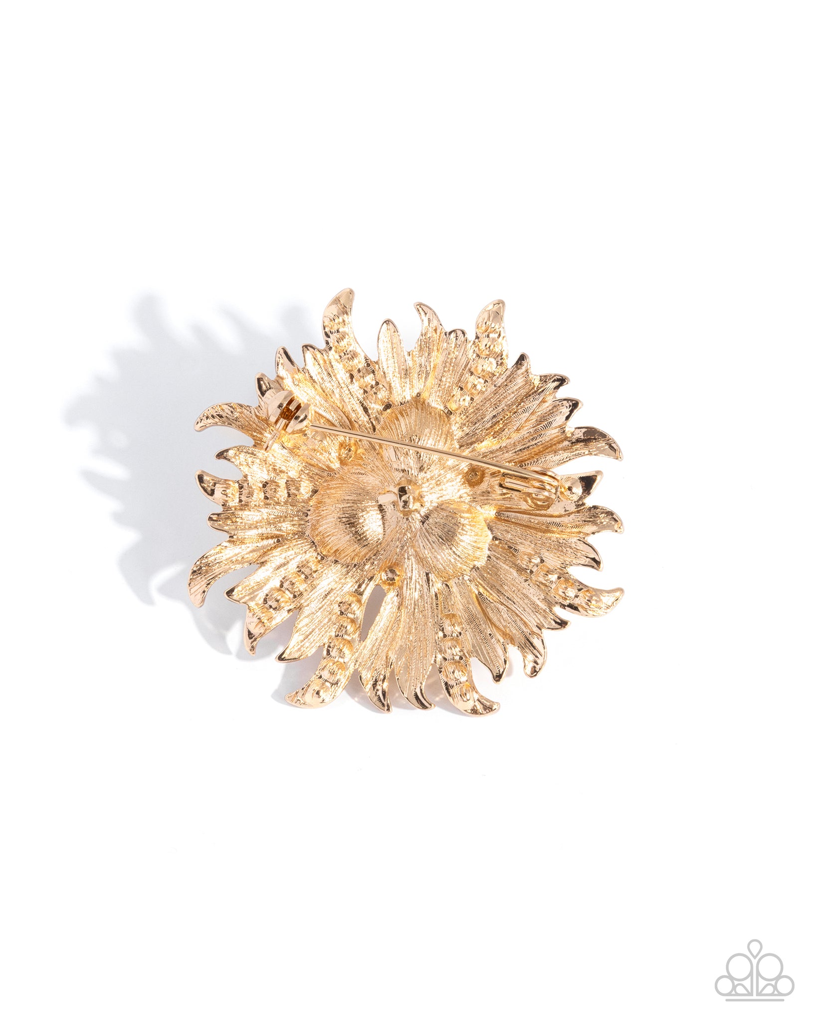 Featuring oversized pearls and white rhinestone detailing, a textured, glistening gold sun stands out for a radiant, refined display. Brooch measures approximately 2" in length and 2" in width.