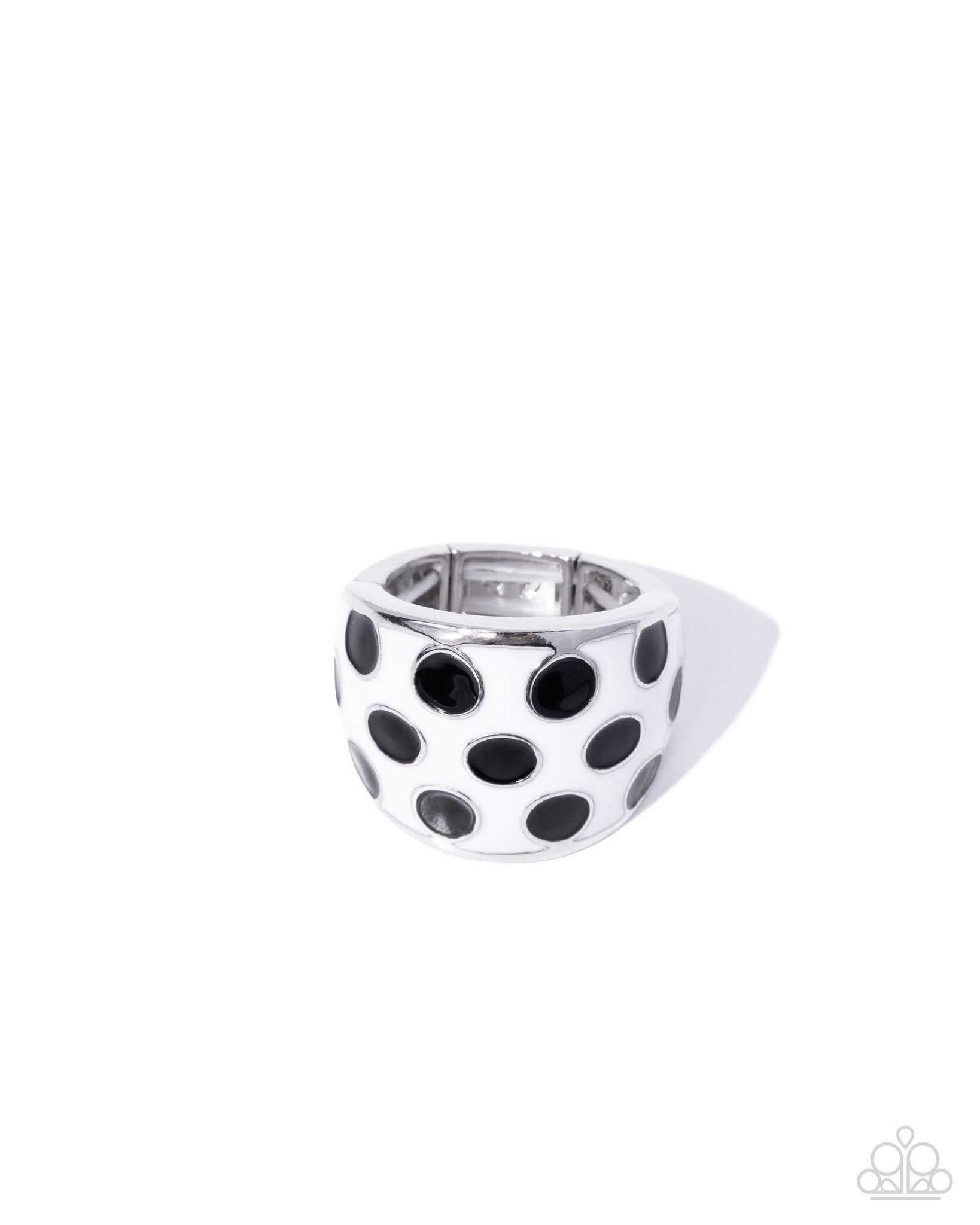 Featuring black-painted spots, a white-painted silver band stands out atop the finger for a modern, memorable look. Features a stretchy band for a flexible fit.