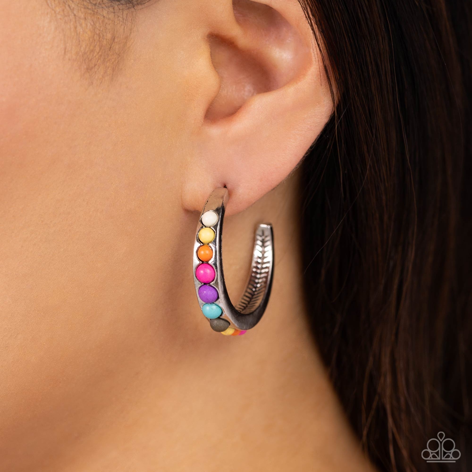 The front of a dainty silver hoop is dotted in a row of multicolored stone beads, creating a colorfully rustic look. Earring attaches to a standard post fitting. Hoop measures approximately 1" in diameter.