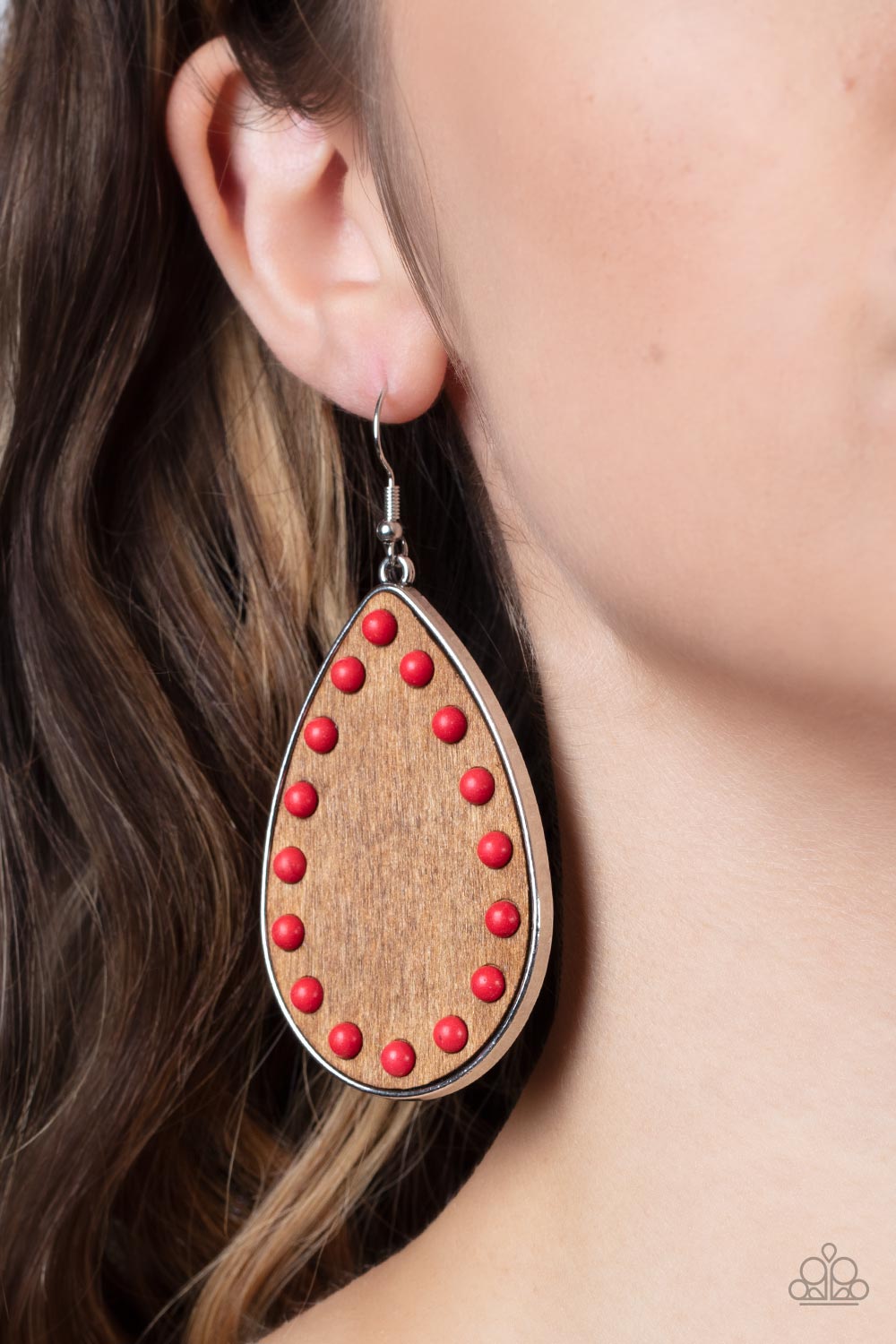 Dainty red stone beads border an earthy wooden teardrop frame that is encased in a sleek silver fitting, creating a whimsical woodsy lure. Earring attaches to a standard fishhook fitting.