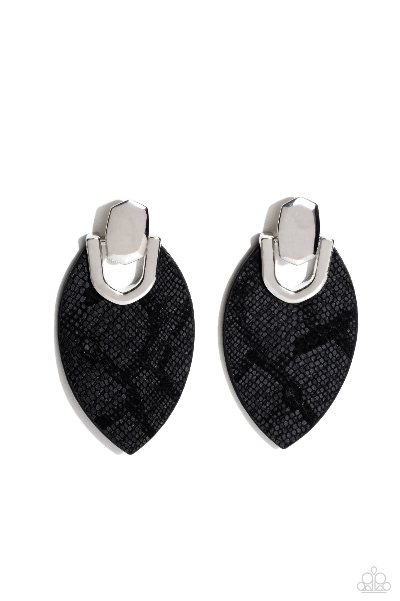 Featuring python-like texture, an oval black leather frame attaches to a bold silver fitting, creating a wild lure. Earring attaches to a standard post fitting.