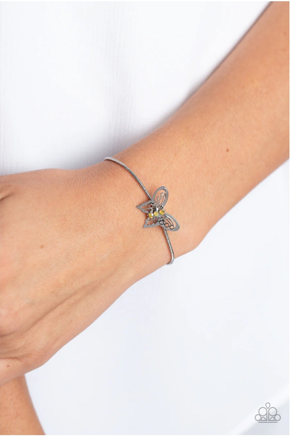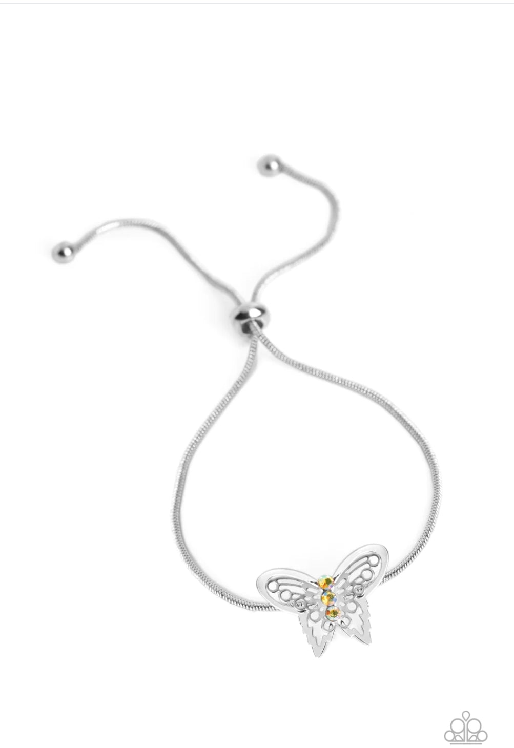A deceptively simple silver butterfly charm glides along a silver snake chain for a whimsical flair along the wrist. Dainty, yellow rhinestones, brushed in a UV shimmer, encrust along the butterfly's body, creating an understated shimmer, while intricate, airy wings fold out from the sparkle, adding a 3D effect to the design. Features an adjustable sliding knot closure. Due to its prismatic palette, color may vary.
