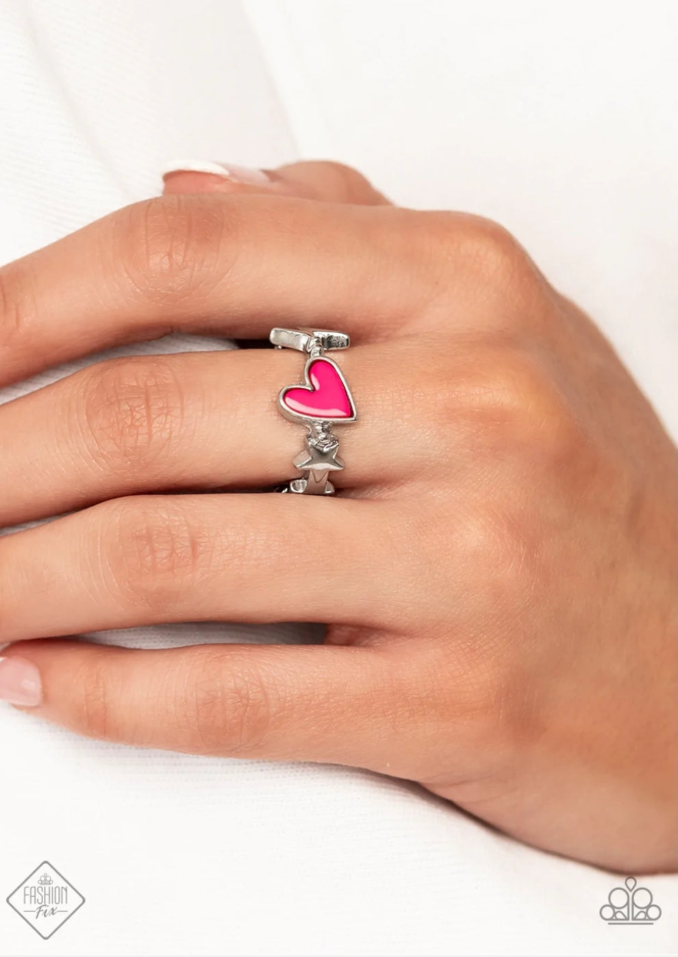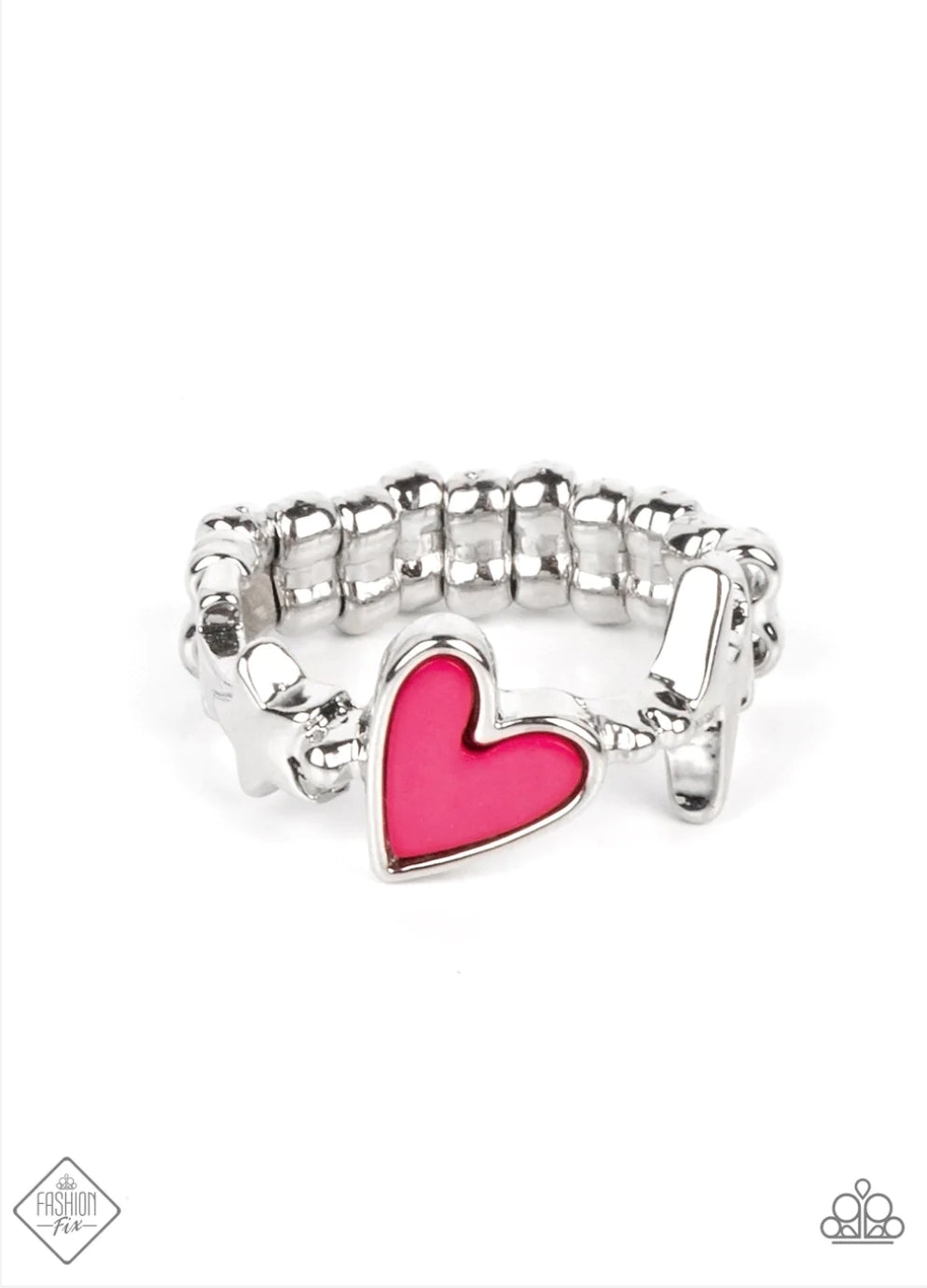 A small pink heart is wrapped in a thick silver frame and nestled between a tiny lightning bolt and star on a skinny silver band that arcs across the finger. Features a dainty stretchy band for a flexible fit.