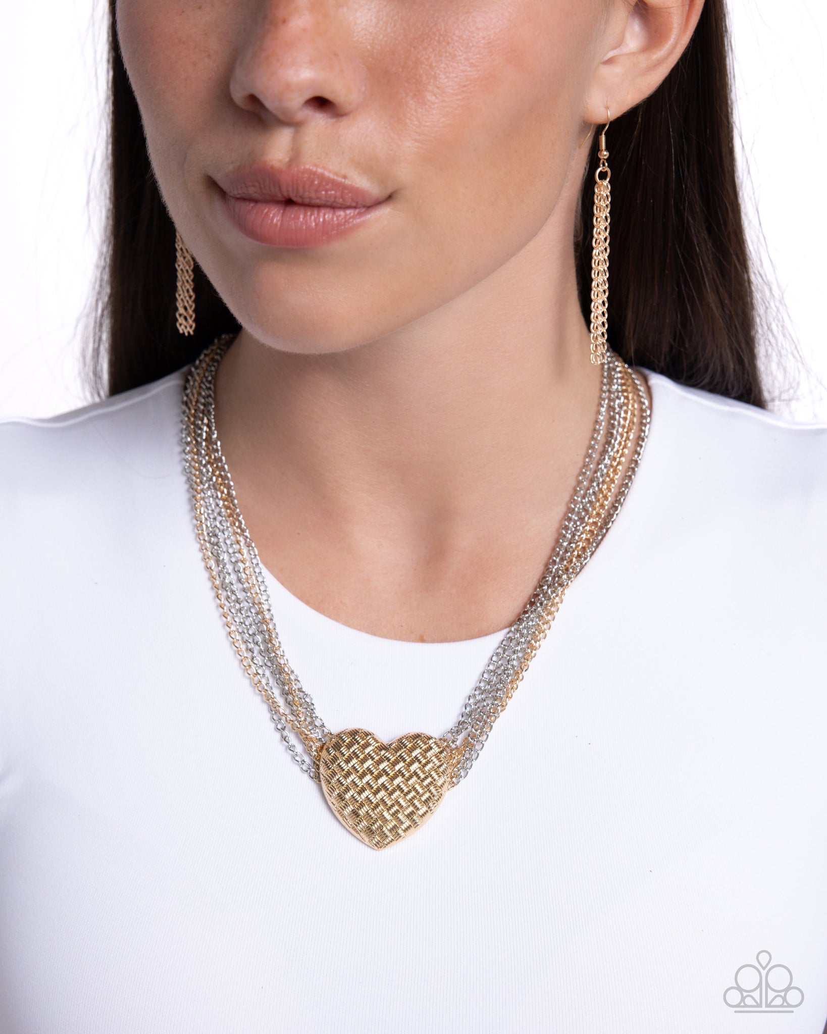 Featuring a metallic, checkerboard textured motif, an oversized gold heart pendant is centered between copious strands of classic silver and gold chains for a dramatically devoted display. Features an adjustable clasp closure.