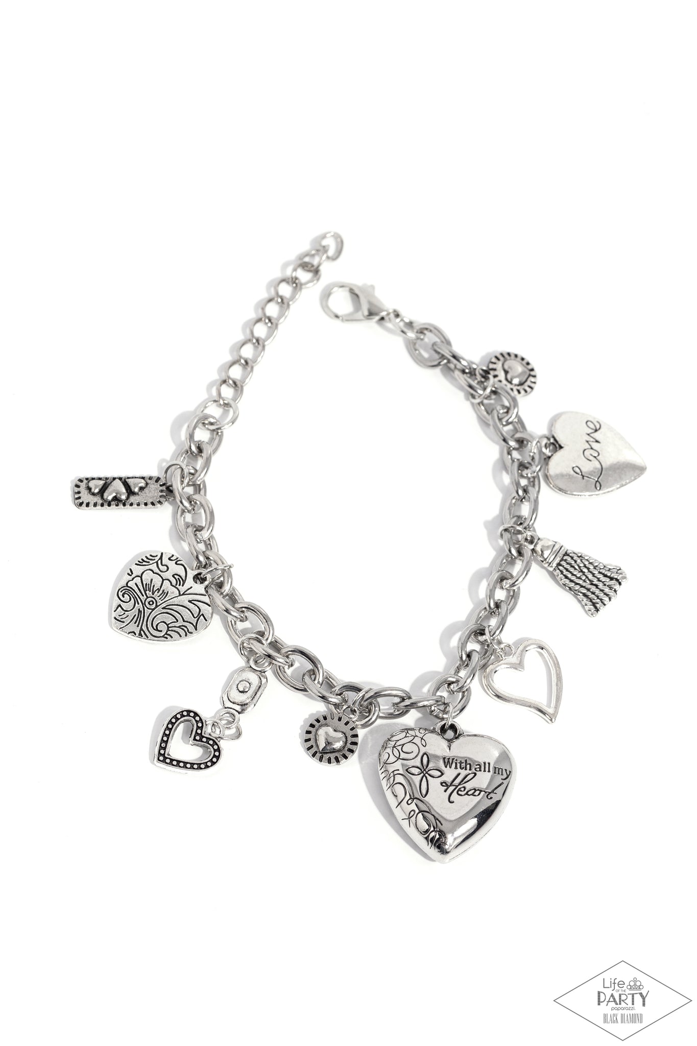An array of silver heart charms trickle from a section of bold silver chain, creating a whimsical fringe around the wrist. The largest heart charm is inscribed with the phrase, “With all my heart” on one side and a short bible verse on the other that reads, "Love the Lord your God with all your heart. Luke 10:27.” Features an adjustable clasp closure.