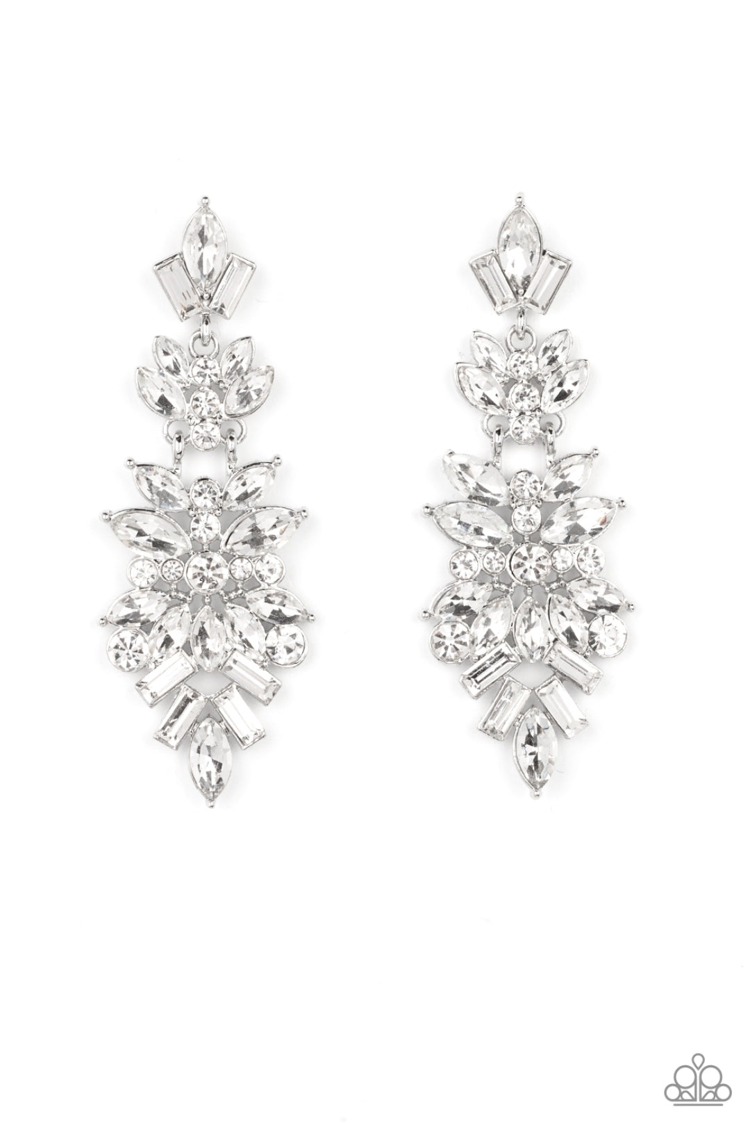 Trestles of round, marquise, and emerald cut rhinestones cluster into three sparkly segments as they link into a jaw-dropping lure, resulting in an icy statement piece. Earring attaches to a standard post fitting.