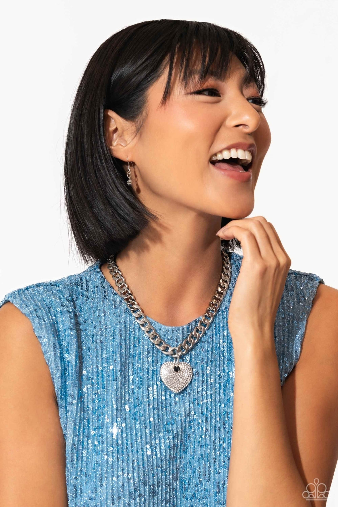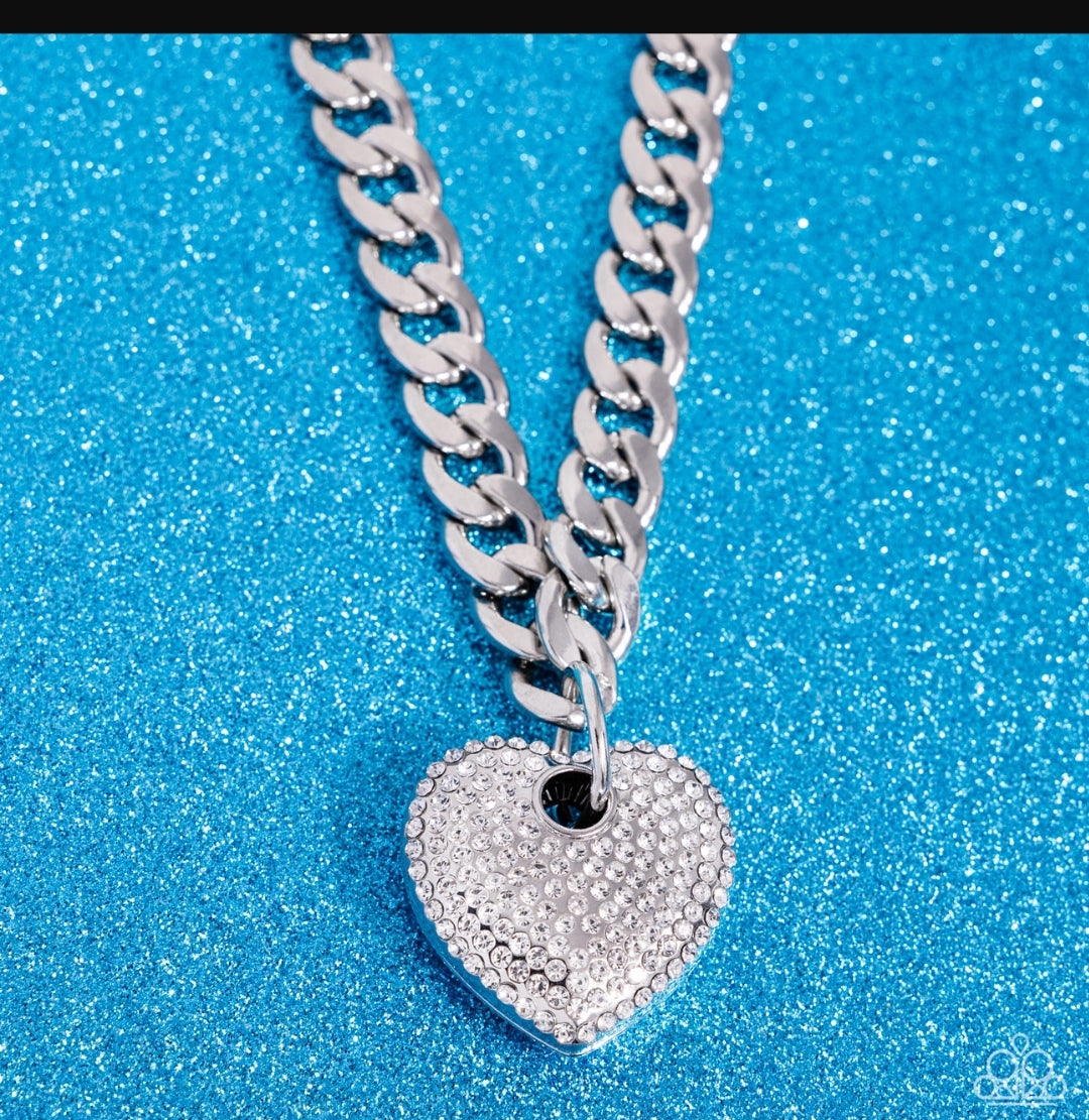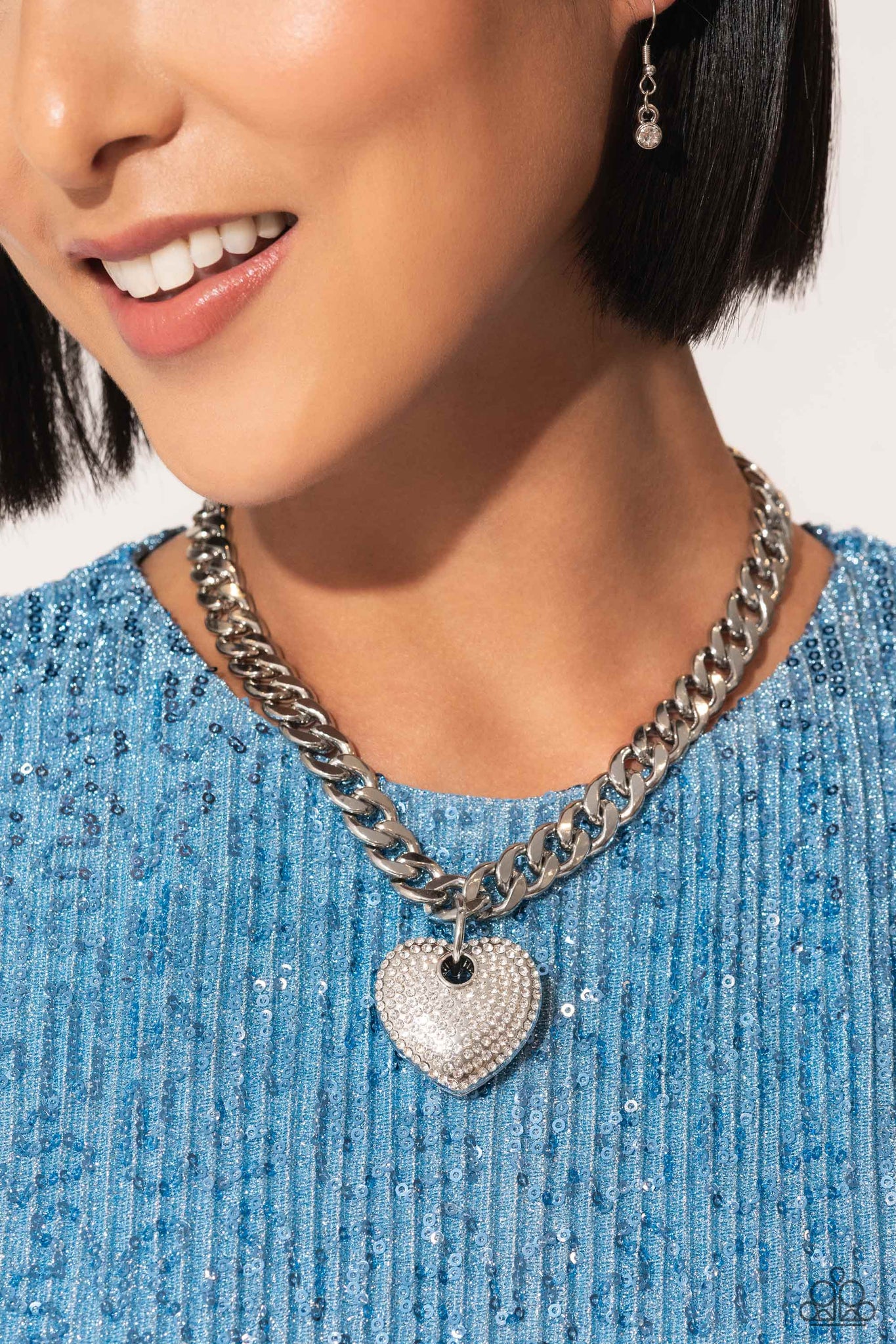 Featuring an intense white rhinestone embellishment, an oversized silver heart frame swings from the bottom of a thick silver curb chain for an edgy declaration. Features an adjustable clasp closure.