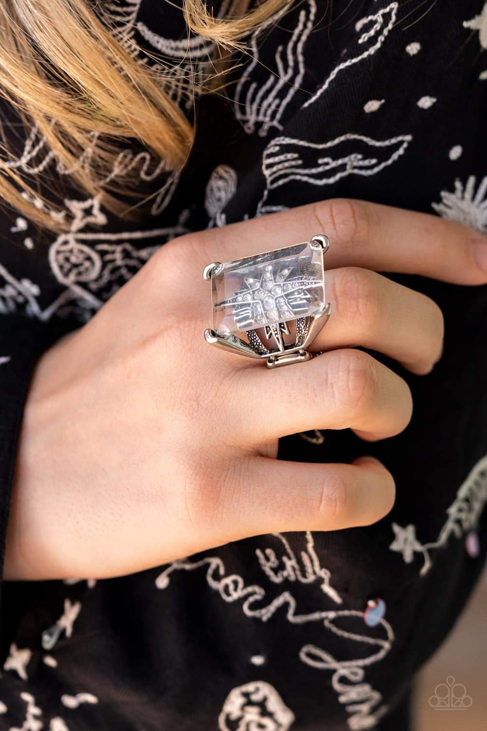A white rhinestone dotted star twinkles behind a glassy pane that seemingly floats atop the pronged frame, resulting in a stellar statement piece. Features a stretchy band for a flexible fit.