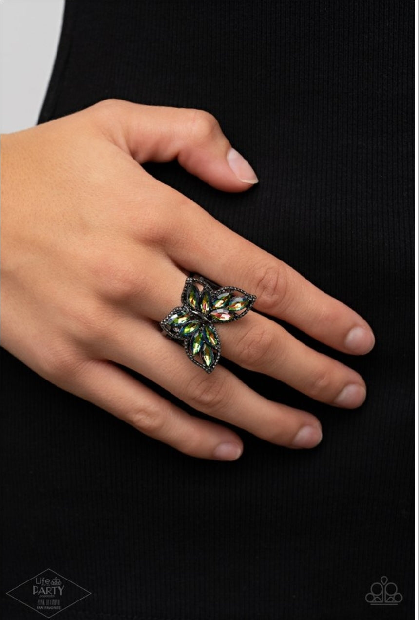 The wings of a studded gunmetal butterfly have been adorned in glittery oil spill marquise rhinestones, creating a glamorous centerpiece atop the finger. Features a stretchy band for a flexible fit.