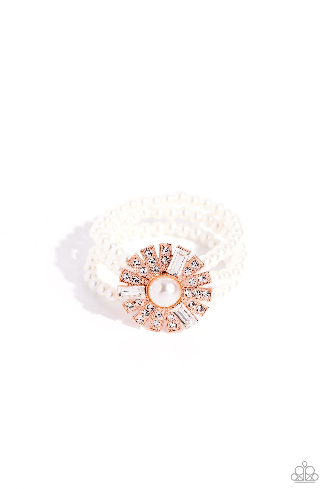 Bracelet: "Gifted Gatsby" - Strung along elastic stretchy bands, three bands of pearls wrap around the wrist. Featured atop the pearly collection, sleek shiny copper metal bars flare out from a mesmerizing pearl center, creating a stacked rhinestone-encrusted fringe of fanning frames. A trio of emerald-cut white gem bars are sprinkled across the dazzling display for a sassy finish.