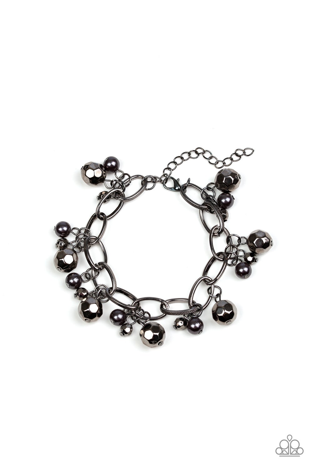 Varying in size, a collection of faceted gunmetal and pearly gunmetal beads swings from a bold gunmetal chain, creating a whimsical metallic fringe around the wrist. Features an adjustable clasp closure.