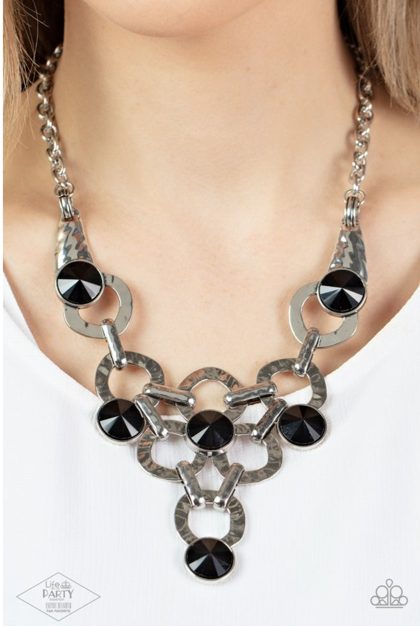 An oversized explosion of glittery black rhinestones, hammered silver links, and hammered oval fittings delicately connects into a metallic net below the collar for an intense industrial style. Features an adjustable clasp closure.